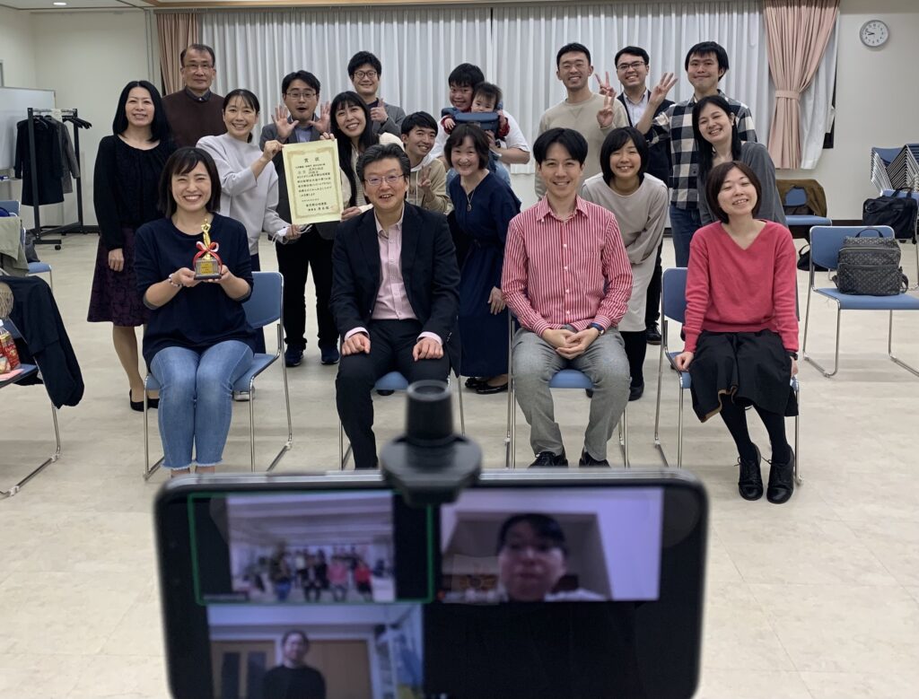 コンクール後の初回の練習で、届いた賞状とトロフィーを持って、記念撮影 ♪